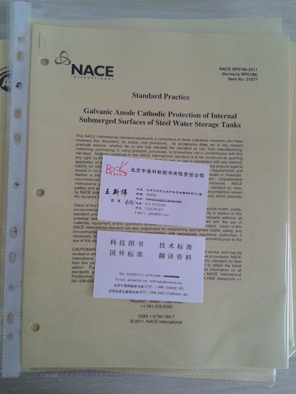 所属分类:首页 >> 国外进口出版物 >> 进口版NACE标准 >> NACE SP 0196-2011 GALVANIC ANODE CATHODIC PROTECTION OF INTERNAL SUBMERGED SURFACES OF STEEL WATER STORAGE TANKS