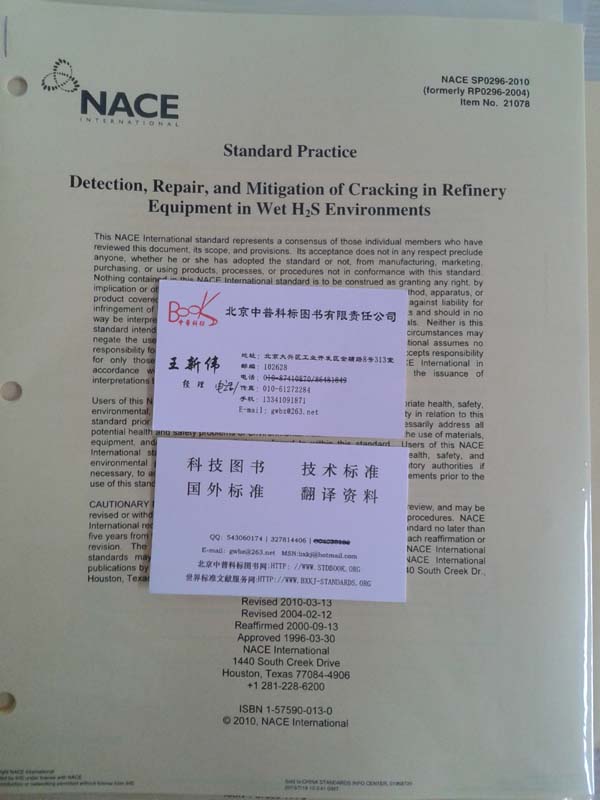 NACE SP 0296-2010 DETECTION, REPAIR, AND MITIGATION OF CRACKING IN REFINERY EQUIPMENT IN WET H2S ENVIRONMENTS