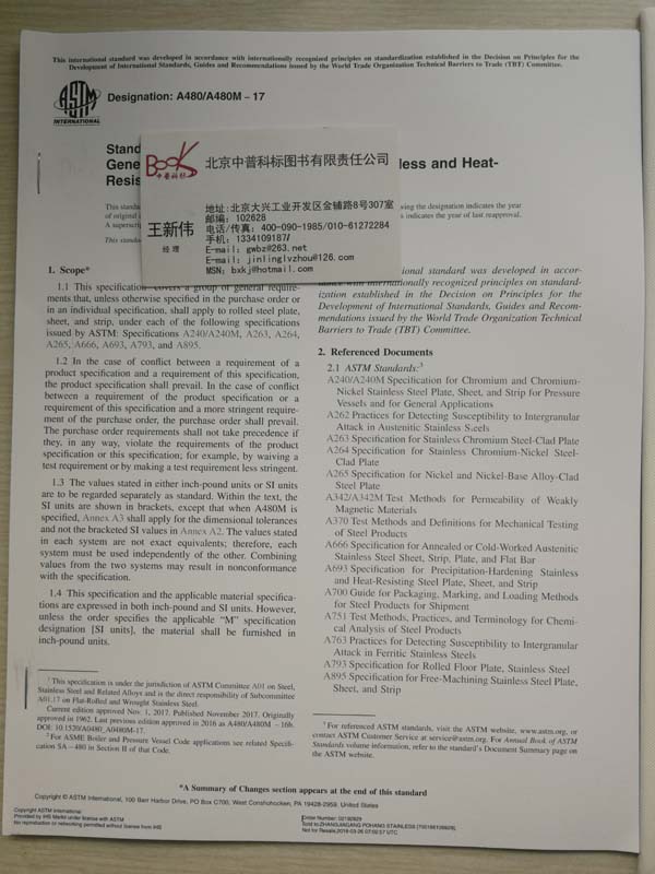 所属分类:首页 >> 国外进口出版物 >> 进口版ASTM标准+图谱 >> 进口原版 美国材料标准 ASTM A480/A480M-2017 不锈和耐热钢轧制钢板、薄板及钢带通用要求