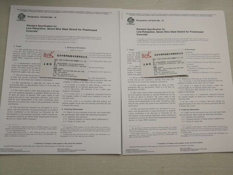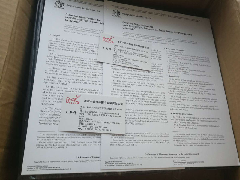 1.1本规范包含两种类型和两个等级的7丝无涂层的用于预应力混凝土结构的钢绞线。这两钢绞线类型分别是低松弛的和除应力的(标准松弛)。低松弛钢绞线被称为标准类型,除应力(标准松弛)的钢绞线将不供应,除非特殊订购。以钢绞线的公称面积为基础,250[1725]级和270[1860]级的最小抗拉强度分别是250ksi[1725MPa]和270ksi[1860MPa]。